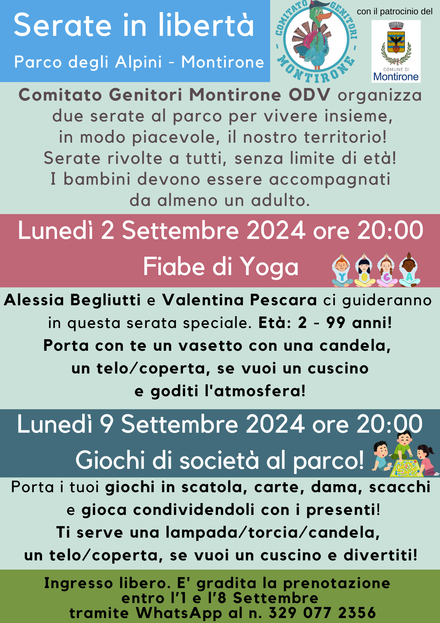 Il comitato genitori organizza per il 2 (fiabe di yoga) ed il 9 (giochi di società) settembre 2024 due serate presso il Parco degli Alpini a Montirone (BS) per vivere insieme il territorio di Montirone.